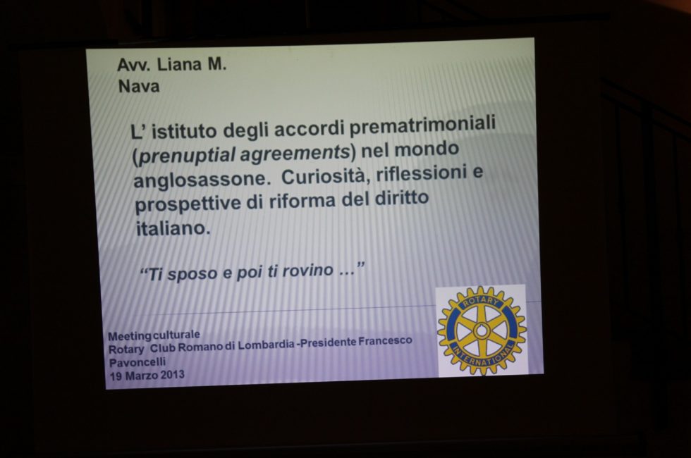 Ristorante “Antico Borgo La Muratella” Cologno al Serio “Prima ti sposo e poi ti rovino” Il diritto di famiglia nel gossip dei paesi anglosassoni Relatrice: Avv. Liana Nava La serata di martedì 19 marzo è stata dedicata ad un escursus sul fenomeno dei “prenuptial agreements” i Patti Prematrimoniali attraverso uno sguardo sulle norme, le […]