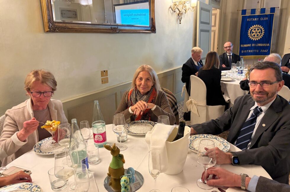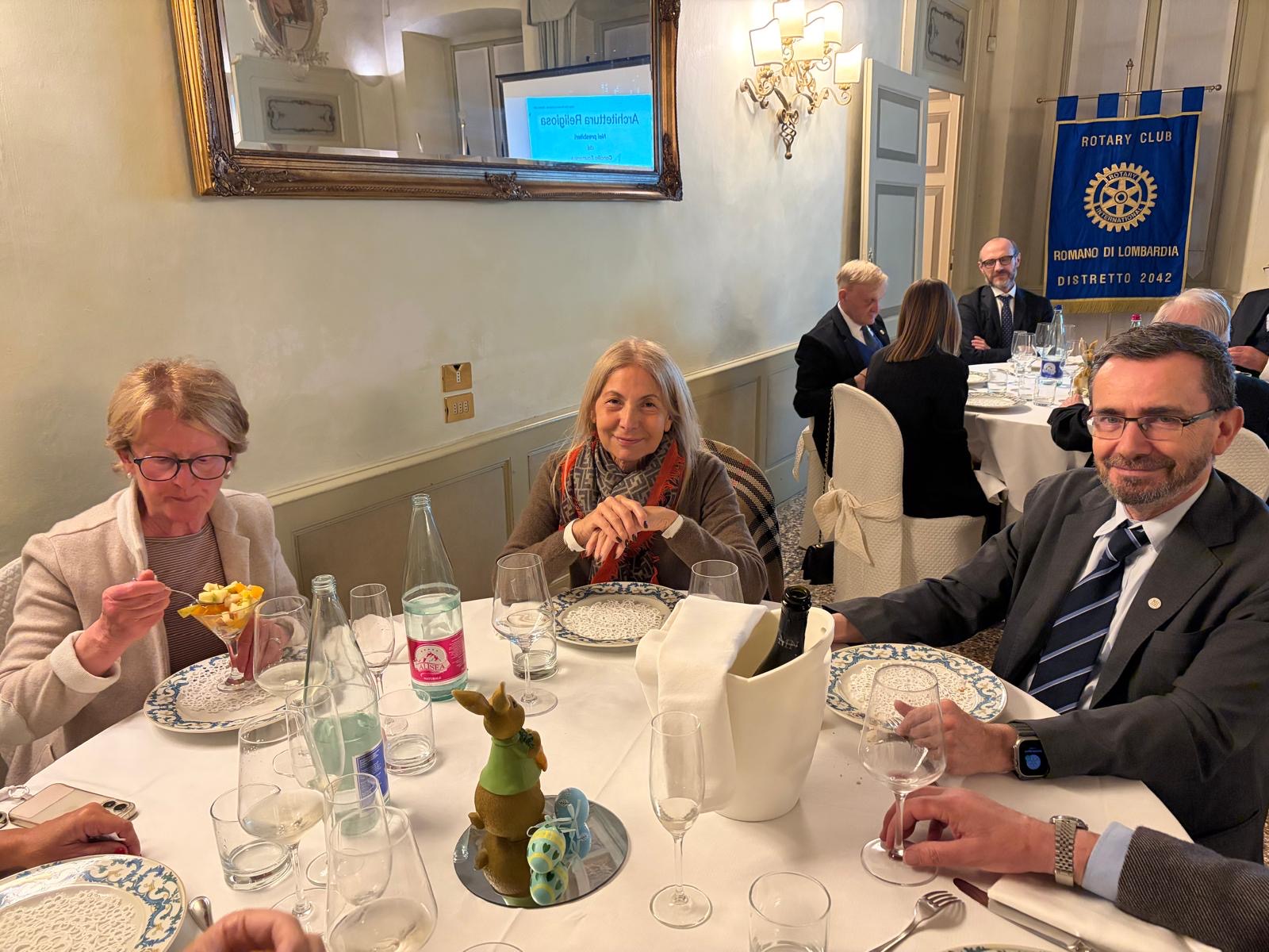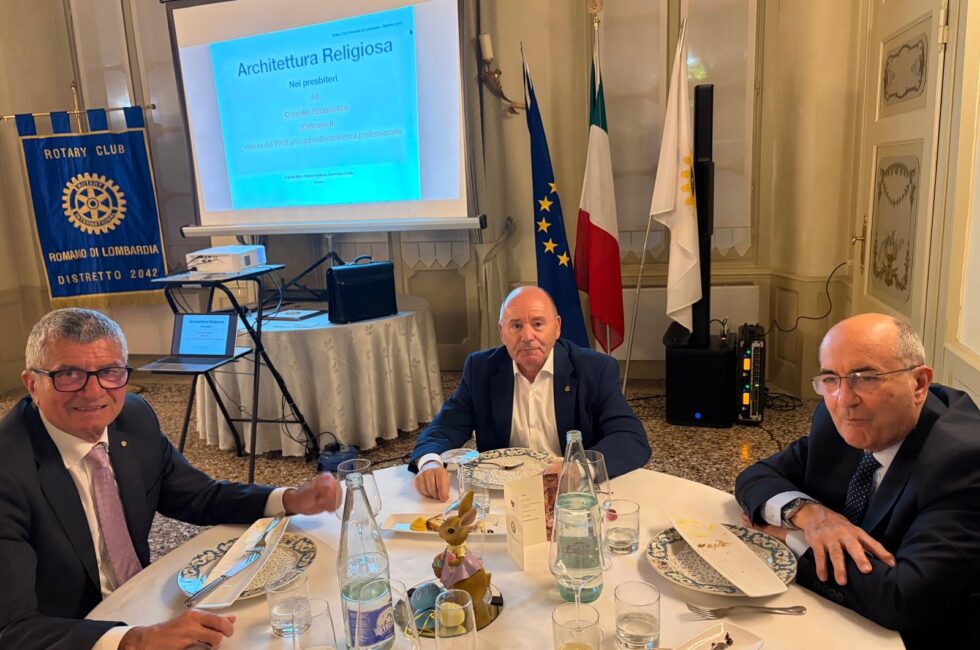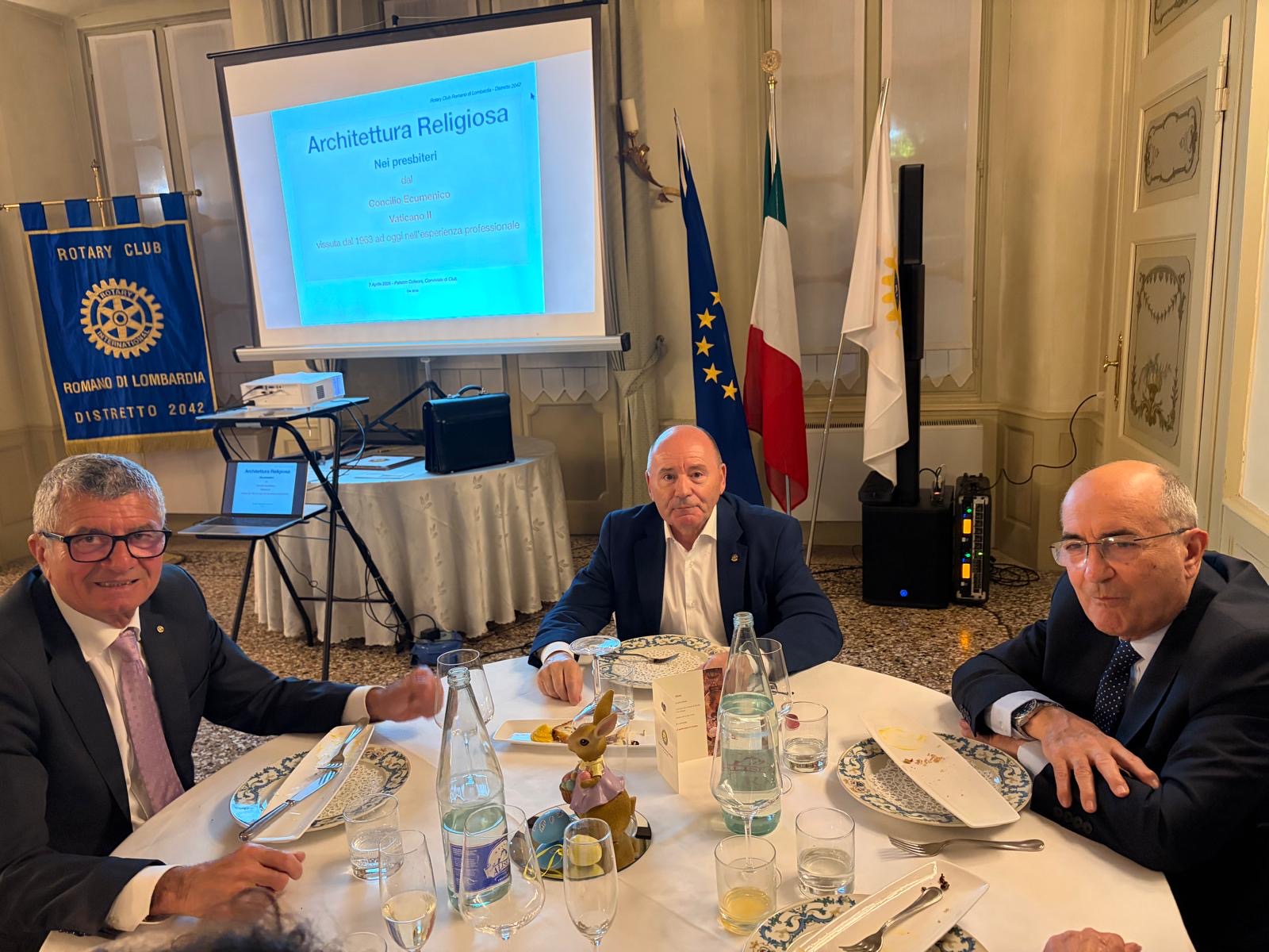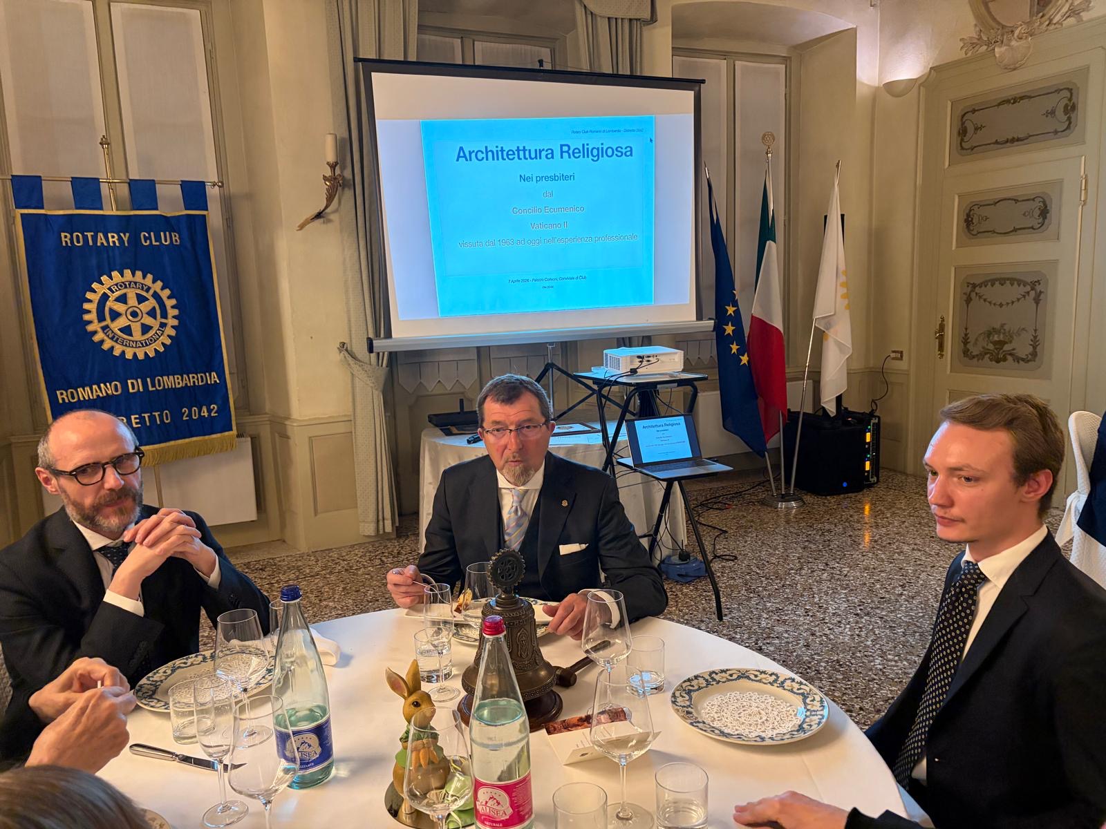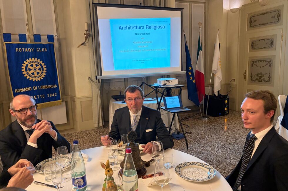 Nonostante tutti conosciamo Francesco, ad inizio serata il Presidente Finazzi, ha presentato il relatore come figura poliedrica che ha interpretato diversi ruoli nella vita sociale delle nostre comunità; è stato amministratore comunale e Sindaco del comune di Martinengo, sua città d’origine, ma è anche rotariano: da socio del Rotary Club Romano ha contribuito alla Fondazione del RC Dalmine Centenario ed è poi stato Assistente del Governatore nel Distretto Milanese dove si è trasferito. Questa sera però è tra noi in veste di professionista e architetto; infatti ha esercitato la professione affrontando molti progetti proprio sul tema della architettura religiosa.