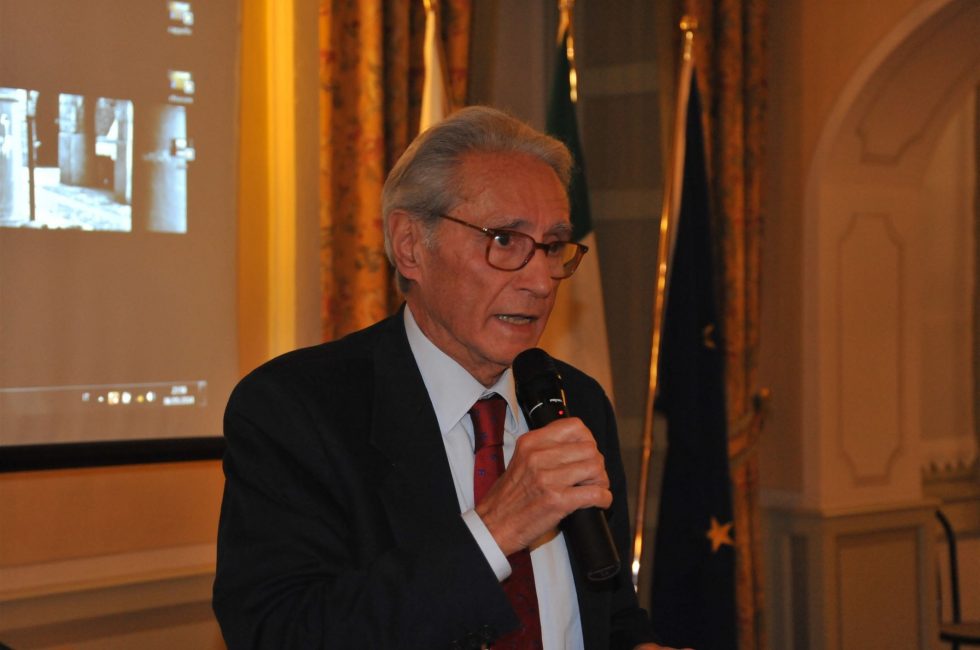 Pino Pisacane da’ poi la parola a Antonio Leoni, tra i fondatori del Club, e suo primo Presidente, che rivolge un caloroso saluto beneaugurale a tutti, ricordando i 6 alti scopi del Rotary e i … primi passi del Romano, con Luosi e Schivardi.